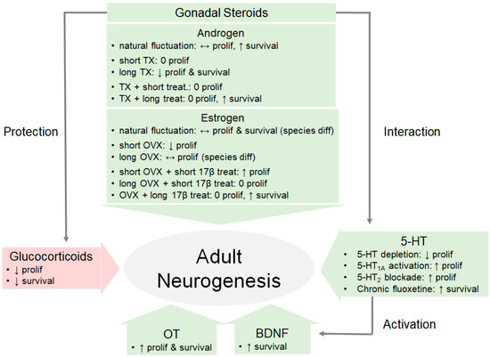 Adult neurogenesis—just one aspect of the highly complex process of neuroplasticity—is not solely regulated by hormones [47]. Indeed, gonadal hormones might have neuroprotective properties in part by interacting with neurotrophic factors as well as neuromodulators [209]. Here, we will discuss the interaction of estrogen and brain derived neurotrophic factor (BDNF)—a neurotrophin that regulates adult neurogenesis. Furthermore, we will review the interaction between estrogen and serotonin (5-HT) and oxytocin (OT), as 5-HT and OT have been shown to play a role in adult neurogenesis. While very little research has been conducted on the interaction between other gonadal hormones (such as testosterone) and BDNF, 5-HT, or OT, we have included these studies into our discussion.