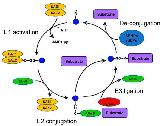 A growing number of studies show the importance of Small Ubiquitin-like Modifier (SUMO) as a regulator of numerous cellular processes in health and disease [1,2]. Within the many types of posttranscriptional modifications of proteins (PTMs), SUMO belongs to the superfamily of ubiquitin-like modifiers that have essential functions in eukaryotes. These functions include regulation of the cell cycle [3]; transcriptional and posttranscriptional control on mRNA levels [4]; DNA damage repair [5]; regulation of signal transduction [6]; and, indirectly, protein degradation [7]. The SUMO family members are short polypeptides of about 100 amino acids that are covalently conjugated to specific lysines in the sequence of their target substrates. SUMO conjugation relies on the coordinated sequential activity of several enzymes: E1 (SUMO-activating); E2 (the SUMO-specific conjugating enzyme Ubc9); and, in some cases, E3 (SUMO ligase, e.g., the PIAS1-4 proteins) [8] (Figure 1). The final step of the cascade is the attachment of SUMO to a specific lysine residue on the substrate undergoing SUMOylation (SUMO conjugation to its protein substrate). However, in contrast to ubiquitin, SUMO proteins do not directly target proteins for degradation but rather alter substrate localization, solubility, or conformation. SUMOylation is a highly regulated and reversible process due to the activity of both positive and negative regulators of SUMO conjugation [9]. One group of proteins that plays a key role in the regulation of SUMOylation are the SUMO proteases SENPs/ULPs (SENtrin-specific Proteases/Ubiquitin-Like Proteases) [10]. Although some SENPs/ULPs play a role in the maturation of SUMO before its conjugation, the most common function of these proteases is the cleavage of SUMO from its target (de-SUMOylation) in a process counteracting SUMO conjugation.