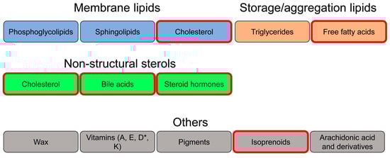 Types of lipids that are suggested to be regulated by SUMOylation: Collection and classification of lipids based on textbook literature [19]. The red frames label lipids that are suggested to be regulated by SUMOylation. These include, for example, ergosterol in yeasts [24,25,26]; isoprenoids in C. elegans [27]; and, in mammals, cholesterol [28], bile acids [29,30], and free fatty acids [31,32]. Lipids are grouped by their biological functions and not by their chemical properties. Cholesterol has both structural and nonstructural roles; thus, it appears in two different categories. * Vitamin D is a byproduct of cholesterol, but it is grouped with other vitamins based on its biological function.