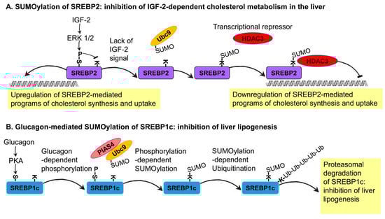 Two prominent cases of the regulation of SREBP-dependent lipid metabolism by SUMOylation: (A) In specific physiological conditions, the hormone Insulin-like Growth Factor 2 (IGF-2) activates two mitogen-activated protein kinases, ERK1 and ERK2, in order to phosphorylate SREBP2. This regulated phosphorylation reduces the level of SREBP2 SUMOylation, thus, leading to the upregulation of genes that encode enzymes of sterol metabolism, including the LDL receptor (LDLR), squalene synthase, and HMG-CoA synthase [28]. In the absence of the IGF-2 signal, SREBP2 SUMOylation leads to the inhibition of the transcriptional activity of SREBPs through the recruitment of a corepressor complex that includes the histone deacetylase 3 (HDAC3) [28]. (B) In fasting conditions, the secretion of the mouse fasting hormone, glucagon, from the pancreas activates Protein Kinase A (PKA), which phosphorylates SREBP1c on serine 308. This phosphorylation increases the levels of SREBP1c SUMOylation, leading to its ubiquitination-dependent degradation. SREBP1c degradation results in the inhibition of lipogenesis in order to switch the metabolic state of the organism toward catabolism [33]. This mechanism was further elucidated by the overexpression of the SUMO E3 ligase, PIAS4, in obese db/db mice, which leads to the inhibition of lipid synthesis. Moreover, the suppression of PIAS4 activity in lean mice triggers the expression of SREBP1c target genes that stimulate hepatic lipogenesis [33].