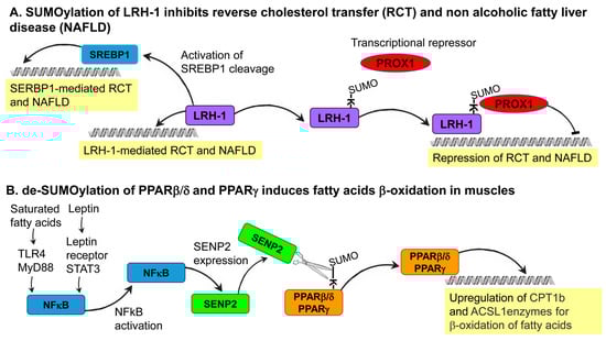 One of the best examples of a SUMO-regulated nuclear receptor that controls lipid metabolism is the Liver Receptor Homolog-1 (LRH-1)—a central regulator of cholesterol homeostasis. The primary role of LRH-1 is to facilitate the process of reverse cholesterol transport (RCT) from peripheral tissues to the liver and the subsequent excretion of cholesterol and bile acids from the liver to the alimentary system. In a mouse model system, blocking the SUMOylation of lysine 289 in LRH-1 was shown to result in the upregulation of a set of genes related to cholesterol metabolism and an increased level of cholesterol and bile acid excretion [29]. Mechanistically, SUMO conjugation results in the binding of the transcriptional-repressor PROspero-related homeoboX 1 (PROX1) to LRH-1, and the LRH/PROX1 complex inhibits the expression of genes that function in bile acids and cholesterol metabolism (Figure 4A). Another possible mechanism by which SUMO may inhibit LRH-1 function is the accumulation of SUMOylated LRH-1 in promyelocytic leukemia protein nuclear bodies, which prevent the access of LRH-1 to the chromatin [65]. These two proposed mechanisms underlie SUMO as a negative regulator of LRH-1 function and, consequently, the RCT process of cholesterol and bile-acids excretion [29]. In addition, introducing to the mouse genome a genetically engineered variant of LRH-1 that cannot be SUMOylated results in a high level of SREBP1 processing. An increase in the level of SREBP1 cleavage facilitates the execution of lipogenesis programs in the liver, which leads to the development of nonalcoholic fatty liver disease [66]. This observation demonstrates how the direct effect of SUMO conjugation on one protein, LRH-1, results in the modified activity of another master regulator of lipid metabolism, SREBP1.