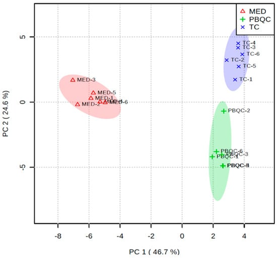Principal component analysis of polar metabolites of Toxocara canis excretory-secretory products (ESPs) showing clear separation from the media component. MED—culture media samples, TC—T. canis ESP samples, PBQC—pooled biological replicates for quality control (pooled from the biological replicates of T. canis ESPs and culture media samples). Data analysed using MetaboAnalyst 4.0 (N = 6 replicates).