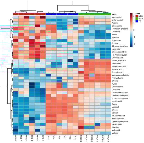 Heat map of polar metabolites of T. canis ESPs showing metabolite patterns by groups. The deep brown color indicates the highest concentrations (based on peak intensities/areas) and the deep blue indicates lowest or negligible concentrations. MED—culture media samples, TC—T. canis ESP samples, PBQC—pooled biological replicates for quality control (pooled from the biological replicates of T. canis ESPs and culture media samples). Data analysed using MetaboAnalyst 4.0 (N = 6 replicates).