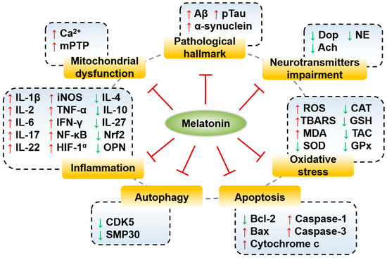 Schematic representation of melatonin therapy by targeting molecular signaling pathways in neurodegenerative diseases with different pathogenic mechanisms. Melatonin inhibits pathological hallmarks, oxidative stress, inflammation, neurotransmitter impairment, mitochondrial dysfunction, apoptosis and autophagy. mPTP, mitochondrial permeability transition pore; Dop, dopamine; Ach, acetylcholine; NE, norepinephrine; TBARS, thiobarbituric acid reactive substances; CAT, catalase; GSH, glutathione; TAC, total antioxidant capacity; GPx, glutathione peroxidase; MDA, malondialdehyde; ↑, induction; ↓, reduction.