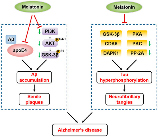 The regulation of Aβ and tau through different kinases in Alzheimer’s disease (AD), which is attenuated by melatonin. Melatonin directly binds to and inhibits apoE4, which enhances Aβ toxicity via combination with Aβ, thereby reducing Aβ pathology in AD. Moreover, melatonin suppresses the reduction of PI3K activity, pSer473 on Akt and pSer9 on GSK-3β, leading to the reduction of Aβ aggregation in AD. Melatonin attenuates tau pathology by regulating several kinases such as GSK-3β, CDK5, PKC, PKA and DAPK1, and the protein phosphatase PP-2A in AD. ↓, reduction.