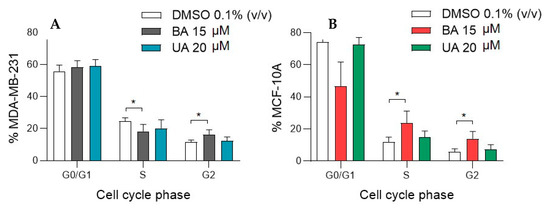Cell cycle phase distribution of (A) MDA-MB-231 and (B) MCF-10A cells, treated with betulinic acid (BA) or ursolic acid (UA), for 48 h. DMSO was the solvent control. Each column and bar represent, respectively, the mean and the standard deviation. Four replicates considered. Statistically significant differences between DMSO controls and BA or UA treated samples are indicated with * (p-value < 0.05, Tukey’s test).
