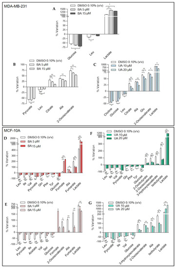 Variations in metabolites consumed (negative bars) and excreted (positive bars) by cells upon exposure to triterpenic acids (TAs), as assessed by comparison to acellular culture media. Consumption and excretion patterns are shown for control cells and: (A) MDA-MB-231 treated with betulinic acid (BA) for 48 h, (B) MDA-MB-231 treated with BA for 48 h followed by 24 h recovery in fresh medium, (C) MDA-MB-231 treated with ursolic acid (UA) for 48 h followed by 24 h recovery in fresh medium, (D) MCF-10A treated with BA for 48 h, (E) MCF-10A treated with BA for 48 h followed by 24 h recovery in fresh medium, (F) MCF-10A treated with UA for 48 h, (G) MCF-10A treated with UA for 48 h followed by 24 h recovery in fresh medium. Four independent replicates considered. ** p-value < 0.01; * p-value < 0.05. Three-letter code used for amino acids. Different scale used in each graph according to variation range.