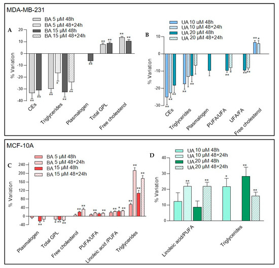 Lipid-related variations in organic extracts from MDA-MB-231 breast cancer cells (A,B) and MCF-10A cells (C,D), treated with betulinic acid (BA) or ursolic acid (UA), relatively to untreated controls. Four independent replicates considered. ** p-value < 0.01; * p-value < 0.05. CEs, cholesteryl esters; PUFA, polyunsaturated fatty acyl chains, UFA, unsaturated fatty acyl chains; GPL, Glycerophospholipids; FA, total fatty acids. Different scale used in each graph according to variation range.