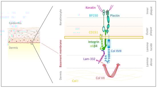 Hemidesmosomal integrin α6β4. Integrin α6β4 is a major component of hemidesmosomes. The cytoplasmic part of integrin β4 is located in the outer plaque close to the plasma membrane and is connected via plectin and bullous pemphigoid antigen 1 isoform e (BPAG1e/PB230) in the inner plaque to the intracellular keratin filaments. Extracellularly, integrin α6β4 binds laminin-332 and CD151 to stabilize hemidesmosomes. Additionally, the transmembrane collagen XVII binds integrin β4, plectin and BPAG1e as well as integrin α6 and laminin-332 in the extracellular space. Laminin-332 further links with collagen VII and together these proteins connect keratinocytes to the underlying basement membrane [51,52].