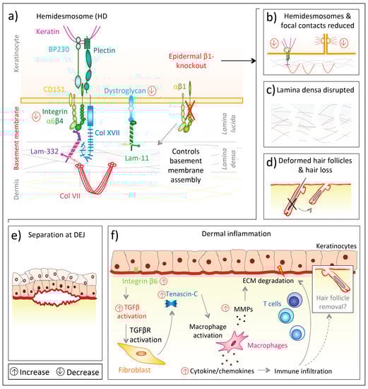 Epidermal integrin β1 deficiency in mice and its consequences. (a) Loss of epidermal integrin β1 decreases the laminin receptor dystroglycan and integrin α6β4, which is a major component of hemidesmosomes [102,103]; (b) Integrin β1-deficient keratinocytes have fewer hemidesmosomes and focal adhesions [102]. The skin in epidermal integrin β1-deficient in mice presents with diminished lamina densa (c) [102], deformed hair follicles resulting in hair loss (d) [104] and (e) show separation at the dermal–epidermal junction (DEJ) and dermal inflammation (f) [105]. A proposed mechanism of the latter is that loss of integrin β1 increases epidermal integrin β6, which is involved in transforming growth factor β (TGFβ) activation. Increased TGFβ signaling upregulates, among others, tenascin-C, fostering dermal cytokine/chemokine production by macrophages, which leads to immune cell (T-cells, mast cells) recruitment. Macrophages also likely cause the increase of matrix metalloproteinases (MMPs) and all together extracellular matrix (ECM) degradation, modified from and inspired by Kurbet et al. [105].