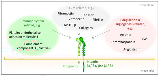 Integrin αV ligands. Integrin αV-containing integrins recognize a multitude of proteins linked to ECM assembly, inflammation or angiogenesis. The selectivity is dependent on the β-subunit [10].