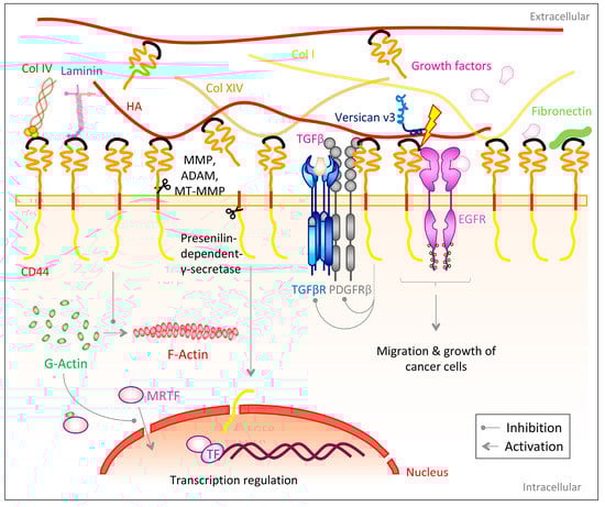 CD44 interacts with various ECM components and cell-surface receptors. CD44 acts as receptor for hyaluronan (HA) [238,239], though can also bind other ECM proteins, such as fibronectin [241], laminin [241], heparin-binding growth factors [245] or collagen I [241], IV [246] and XIV [247]. The extracellular domain of CD44 can be cleaved by MMPs or ADAMs [253,254,255]. They create a soluble form of CD44, which competes with membrane-bound CD44 for HA binding in some cells [256]. The remaining intracellular domain can be released into the cytoplasm by the presenilin-dependent-γ-secretase, where it regulates gene transcription [257,258]. CD44 also prevents the conversion of G- to F-actin. G-actin binds cytoplasmatic myocardin-related transcription factor (MRTF) and hinders it from translocating to the nucleus, where it could co-activate transcription factors (TF) [259]. CD44 interacts with the transforming growth factor β receptor (TGFβR) and the platelet-derived growth factor receptor β (PDGFRβ) and upon HA-activation negatively regulates them [248,249]. CD44 also associates with epidermal growth factor receptor (EGFR) [250,251,252]. Versican possibly competes with CD44 to bind HA and with EGF to bind EGFR and therefore blocks CD44 and EGFR signaling [260].