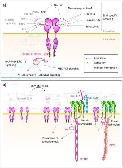 Epidermal growth factor (EGF) receptor (EGFR) interactions with the ECM. (a) EGFR recognizes ligands, such as EGF, transforming growth factor (TGF)-α, amphiregulin (AR), betacellulin (BTC), heparin-binding EGF-like growth factor (HB-EGF), epigen (EPGN) or epiregulin (EREG) [352,353]. Upon their binding the receptor dimerizes followed by auto-phosphorylation and induction of diverse intracellular signaling events [351,352,354,355]; (b) Stiffening of the ECM, as found in tumors, causes EGFR overexpression and increased EGF bioavailability, which fuels tumorigenesis [359,360,361]. EGFR also associates with integrin α6β4 and via the Fyn kinase phosphorylates β4 integrin if integrin α6β4 is bound to laminin-332 [57,362]. This leads to hemidesmosome disruption and fosters tumor proliferation and invasion [57,362]. Furthermore, a stiff ECM increases EGFR phosphorylation, but this is also dependent on focal adhesions, since EGFR interacts with them and might be regulated by the focal adhesion kinase (FAK) [359].