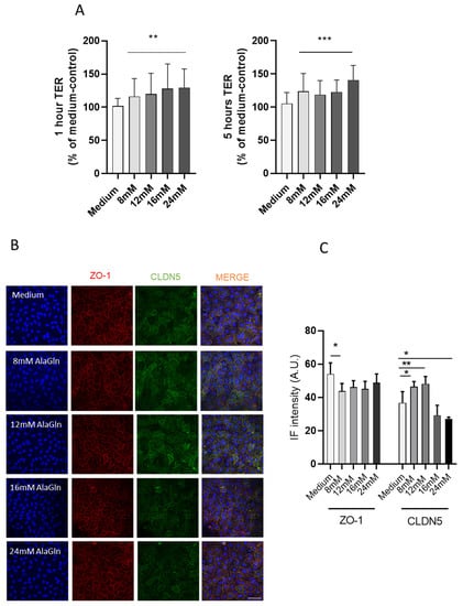 Addition of AlaGln to HUVEC culture medium resulted in a dose-dependent increase of TER. After one 1 h of incubation TER increased to (116 ± 27) %, (120 ± 31) %, (128 ± 37) %, (130 ± 28) % with 8, 12, 16, and 24 mM AlaGln compared to medium control (ANOVA p = 0.006; Figure 1A). After 5 h, TER increased to (124 ± 27) %, (119 ± 21) %, (122 ± 18) % and (141 ± 22) %, respectively (ANOVA p < 0.0001). TER reflects mainly the paracellular barrier integrity in leaky endothelia and the paracellular barrier is mainly defined by the tight junctions, of which ZO-1 is a key intracellular component [41], connected to the claudins, while CLDN5 is a key endothelial sealing junction protein [39]. ZO-1 abundance was reduced in HUVEC with AlaGln, while CLDN5 increased at currently in clinical trials used pharmacologic levels of about 8 mM and decreased with higher AlaGln concentrations (Figure 1B,C).
