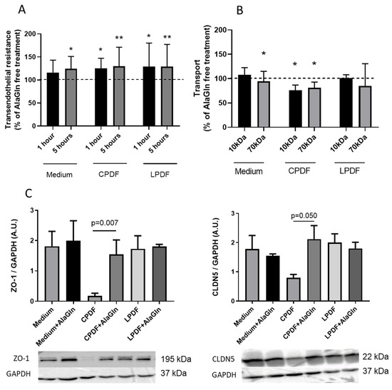 Figure 2. Supplementation of 8 mM alanyl-glutamine (AlaGln) to CPDF and LPDF increased electrical resistance of HUVEC after 1 and 5 h (A). 10 kDa and 70 kDa dextran transport was reduced with CPDF only (B). Reduction of ZO-1 and CLDN5 protein abundance in CPDF treated HUVEC was restored with AlaGln supplementation (C). Data are mean ± SD. A.U. = arbitrary units. * p < 0.05, ** p < 0.01.