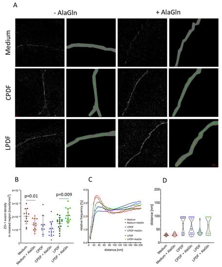 Figure 3. Single molecule localization microscopy was used for quantification of positioning and clustering of single ZO-1 molecules at the junction area of HUVEC, cultured on transwell filters. Representative localization images reconstructed from the loci data matrix are given in (A) with and without masking, mask width is 100 nm (scale bar = 1 µm). (B) ZO-1 molecule density for given treatments, (C) Ripley frequency distance curves: relative frequencies of point-to-point distances given on the x-axis (D) respective violin plots of the distances at which most molecules were found. Alanyl-glutamine (AlaGln) reduced the number of fluorophore signals in the membrane of endothelial cell incubated with medium and increased it with LPDF incubation (B). ZO-1 molecule clustering was changed in a characteristic way when AlaGln was added (C,D).