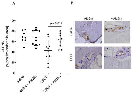Figure 4. Supplementation of conventional PD fluid (CPDF) with 8 mM alanyl-glutamine (AlaGln) in mice treated for 7 weeks increased arteriolar endothelial CLDN5 abundance (left panel; means ± SD are given; p = 0.017 versus CPDF only) (A). Representative stainings of the mouse parietal peritoneum, illustrating upregulation of arteriolar endothelial CLDN5 with supplementation of AlaGln to CPDF (B). Scale bar = 50 µm.