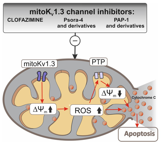 It was shown that increased expression of the Kv1.3 potassium (mitoKv1.3) channel in the mitochondria of many types of cancer cells and participation in the process of apoptosis have made it a potential target in cancer therapy [61]. The mitoKv1.3 channel is located on the inner mitochondrial membrane in the same orientation as on the plasma membrane [32]. Similar Kv1.3 channel is also detected in the Golgi apparatus and in the membrane of endoplasmic reticulum. Activation of the Kv1.3 channel located in plasmalemma leads to increased cell proliferation and differentiation. In contrast, the mitoKv1.3 channel plays a key role in activating the apoptotic pathway. CTLL-2 cells overexpressing mitoKv1.3 channels were sensitive to pro-apoptotic factors, such as TNFα, staurosporine, sphingomyelinase, and C6-ceramide. CTLL-2 cells deficient in mitoKv1.3 channels showed no signs of apoptosis, while cells of the same CTLL-2 line with Kv1.3 channels expressed from a mitochondria-targeted vector showed induction of apoptosis in response to TNFα. Induction of apoptosis in mitochondria occurs by blocking the mitoKv1.3 channel through interacting with lysine 128 pro-apoptotic Bax protein, and as a result, the channel pore is impermeable to K+ ions. Hyperpolarization of the mitochondrial membrane leads to increased synthesis of reactive oxygen species (ROS) and the release of cytochrome c followed by membrane depolarization and initiation of apoptosis [62].
