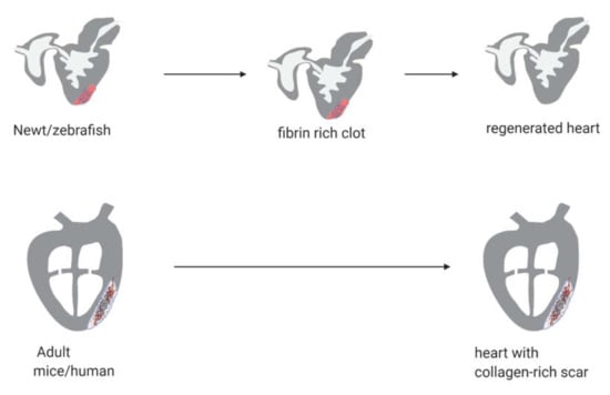 When comparing vertebrate species, a loss of cardiac regenerative potential is observed in mammals []. This observation is not limited to the myocardium but is present in various tissues and organs. During a cardiac regenerative response, signaling from the extracellular matrix (ECM) exerts a vital role in cellular migration, proliferation, and differentiation of cardiomyocytes []. Compared to adult mammals, newt and zebrafish undergo a large scale cardiac remodeling process, including diminished scar formation but with substantial ECM deposition [,,]. In newts and zebrafish, the genes of ECM components are one of the most responsively expressed cardiac gene families after a myocardial injury. The mammalian fibrotic ECM response is less intense and restricted to the injury boundaries, where limited regeneration occurs for a limited amount of time after cardiac injury []. In the adult mammalian myocardium, inflammation, and metabolic genes have been identified as essential factors in cardiac regeneration []. In the following sections, we describe these differences and provide insights into underlying physiological, cellular, and molecular mechanisms.