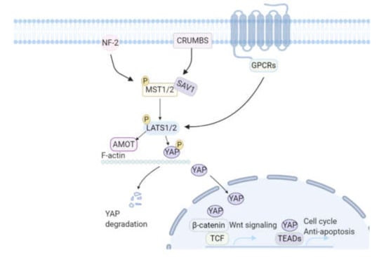 The Hippo-YAP pathway is a conserved tumor-suppressor pathway [,] regulating cell polarity, cell adhesion, and ECM matrix deposition and is the major size-limiting pathway during organ growth. In addition, Hippo signaling participates in organ regeneration and tissue repair, including cell proliferation and survival [,,,]. When activated, LATS1/2 and MST1/2, the human homologs of the Hippo protein, are recruited to the plasma membrane by NF-2 and scaffold protein Salvador (Sav), respectively (Figure 4). MST triggers LATS by phosphorylation and subsequently, active LATS can phosphorylate YAP and its binding protein angiomotin protein (AMOT). Phosphorylation of YAP and AMOT prevents the nuclear localization of YAP. Phosphorylated AMOT, bound to YAP, dissociates from F-actin and translocates to the cytoplasm, where the complex is degraded via the ubiquitin–proteasome system. Upon inactivation, YAP is dephosphorylated and translocates to the nucleus, where it activates gene transcription of cell cycle and anti-apoptosis genes, together with TEAD transcription factors (Figure 4) [,].