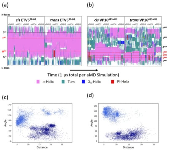 Time-course of TAD structures bound to MED25-ACID. (a) Secondary structure assignments along the vertical primary amino acid sequence are shown across the five independent accelerated molecular dynamics (MD) simulations (aMD1-aMD5) for the cis- and trans-orientations of ETV538–68 relative to MED25. The secondary structure state of each residue is color-coded according to the color scale shown below. The positions of two key amino acid residues, F47 and W57, are highlighted in red and with a dotted line across all ten ETV538–68 aMD trajectories. The positions of residues S34 and A61, marking the approximate N- and C-terminal limit of the α-helical region, respectively, are shown with a black dotted line. (b) Same as in (a), but for the VP16-H1413–452 TAD data. The position of three key amino acid residues, L439, F442 and L444, are highlighted in red and with a dotted line across all ten VP16-H1413–452 aMD trajectories. The positions of residues P415 and L424, marking the approximate N- and C-terminal limit of the most N-terminal α-helical region, respectively, are shown with a black dotted line. For the C-terminal helical region, positions of A434 and L447, demarcating the approximate boundaries of the C-terminal helix, are shown. (c) Phase diagram showing the distance of ETV5-W35 relative to MED25-Q451 across all cis- (light blue) and trans- (dark blue) simulations. Note that in the cis-orientation ETV5-W35 typically remains closely associated (typically with 5–7 Å) with the cleft on MED25 (of which MED25-Q451 is an integral part). In the trans-orientation, ETV5-W35 constantly remains distant (typically 10–22 Å) from the cleft. (d) Same as in (c) but for the distance of VP16-F422 relative to MED25-Q451. See Figure S2 for a more detailed break-down of the angle distributions between MED25 and the TADs in each of the four simulations.