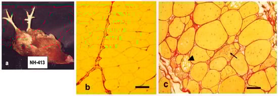 The inheritance pattern was initially thought as an autosomal recessive mode designated as abnormal muscle (am/am) for homozygotes [1,11]. However, because dystrophic phenotypes are often seen in heterozygous muscles, they came to be identified as a co-dominant inheritance designated a gene symbol AM/AM [16,17]. Chicken muscular dystrophy is transmitted by a single gene, but the phenotype is modified by other background genes [16,17,18,19]. One of several lines of dystrophic New Hampshire chickens, line 413, was introduced with normal line 412 from the University of California at Davis to Japan in 1976 [17].