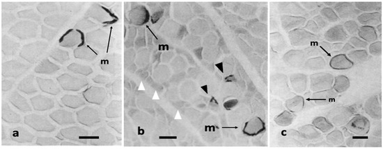 Transverse sections stained for the acetylcholinesterase (AChE) activity with histochemical method at motor endplates (m) of: normal (a); heterozygous (b); and dystrophic (c) pectoralis muscles. The AChE activity in normal pectoralis muscle fibers is confined to the motor endplates, while it extends to the extrajunctional sarcoplasm diffusely in heterozygous and dystrophic fibers. The hypertrophied αR fibers are surrounded by atrophied αW fibers (white arrowheads in (b)), some of which have AChE positive endplates (arrowheads in (b)). The majority of dystrophic fibers (c) are hypertrophy and contain intense AChE activity in sarcoplasm and have motor endplates (m), which are stained weaker and thinner than those in other genotypes. Note a positively stained sarcoplasm, likely “Ring fiber”, at the right lower corner (c), Bars = 50 μm. [17].