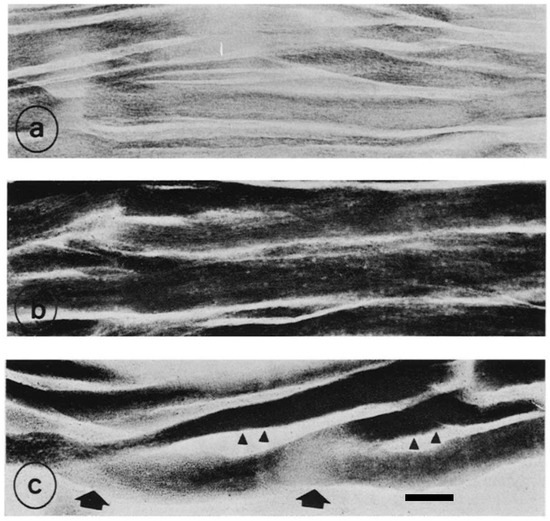 Then, it is of interest to elucidate what happen if dystrophic muscles with considerable amount of Type III collagen fibers in extracellular space and deteriorated myofibrils in immature myotubes, are added the tension to some extent for various periods? The stretch-induced growth in chicken wing patagialis muscles were conducted by Ashmore’s group during three years after 1980. The patagialis muscles, one of the fast twitch muscles, were extended at six weeks of age for 1–5 weeks. The passive stretch is a powerful inducer of muscle growth and the sift of fiber types from αW to αR fibers as the percent of αR fibers had increased from 11% in the control to 43% in the stretched muscles [100,101]. It was also confirmed in rat and rabbit that a chronic increase in tension as a result of stretch applied by the lengthening procedure is a potent stimulus for fast-to-slow myosin transformation and for muscle hypertrophy [102,103].