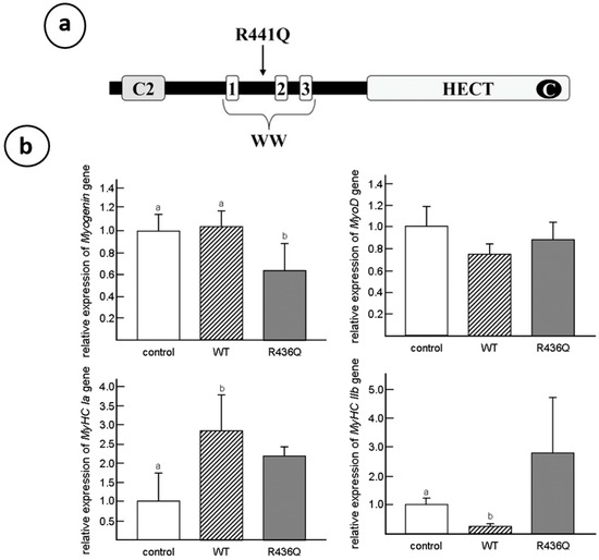 (a) The schematic domain structure of chicken WWP1 and the site of missense mutation. Chicken WWP1 protein is composed of 922 amino acids indicating WWP1 functional domains: C2 domain, three WW domains and HECT domain. C in HECT domain indicates an active cysteine residue. The arrow indicates the site of missense mutation. WW domains bind proline-rich region. (b) Muscle-differentiation markers (Myog, MyoD, MyHC Ia and MyHC IIb) in WWP1-transfected (WT and R436Q) and empty vector-transfected (control) C2C12 cells. Note that the R436Q-transfected cells retained the high expression of both slow MyHC Ia and fast MyHC IIb isoforms compared to control cells. Y-axis indicates relative expression level of each gene to the GAPDH gene expression. Different letters indicate significantly differences (p < 0.05) among column graphs. Adopted from Matsumoto et al. 2008 and 2010 [63].