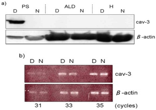Expression of caveolin-3 (Cav-3) at protein and mRNA level. (a) Expression of Cav-3 in M. pectoralis superficialis (PS), M. anterior latissimus dorsi (ALD) and heart (H) was analyzed by Western blotting. Note that PS expressed higher amount of Cav-3 protein (7.12 ± 3.31-fold) in dystrophic chickens (D), while the expression in ALD and H was undetectable as in normal chickens (N). (b) The semi-quantitative RT-PCR analysis indicated that its mRNA expression was at the similar level between dystrophic (D) and normal (N) pectoralis muscle. Adopted from Matsumoto et al. 2010 [85].