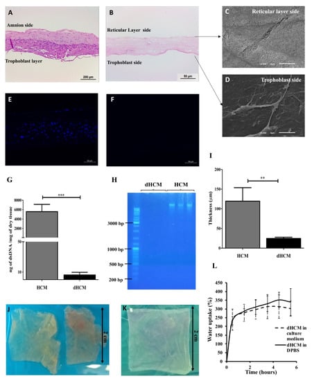 Figure 1. Human chorion membrane decellularization. Representative transversal sections of hematoxylin/eosin (H&E) staining of human chorion membrane (HCM) (A) and decellularized HCM (dHCM) (B). Representative scanning electron microscope (SEM) micrographs of dHCM from the reticular layer side (C) and the trophoblast side (D). Representative transversal sections of DAPI staining from HCM (E) and dHCM (F). Double-stranded DNA (dsDNA) quantification in HCM and dHCM (G). Agarose gel electrophoresis of DNA extracted from HCM and dHCM (H). Thickness of air-dried HCM and dHCM measured with a picometer in at least three different sites (I). Top view of HCM (J) and dHCM (K) cut into pieces of 2 × 2 cm. Swelling behavior of dHCM in culture medium and Dulbecco’s phosphate-buffered saline (D-PBS) (L). ** p ≤ 0.01 and *** p ≤ 0.001.
