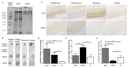 Figure 2. dHCM protein characterization. Representative lanes of two different samples from an SDS-PAGE gel of the digested HCM and dHCM (A). Representative dot blot results for collagen type I, collagen type IV, fibronectin and laminin, in both native and dHCM tissues. Digestion buffer without samples was used as a negative control, while the native protein was used as a positive control (B). Immunolocalization of collagen type I, collagen type IV, fibronectin and laminin in representative transversal sections of HCM and dHCM (C). Quantification of soluble collagen (D), insoluble collagen (E) and sulfated glycosaminoglycans (GAGs) (F) content in HCM, dHCM and the trophoblast layer (TL) in μg/mg of dry tissue. ** p ≤ 0.01; *** p ≤ 0.001 and **** p ≤ 0.0001.