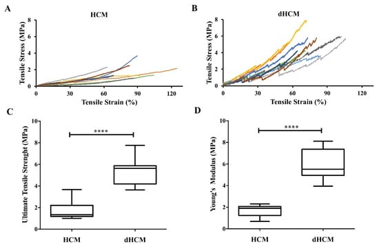 Figure 3. Mechanical properties of native and decellularized HCM. Stress-strain curves of HCM (A) and dHCM (B). Ultimate tensile strength (C) and Young’s modulus (D) of both HCM and dHCM. **** p ≤ 0.0001.