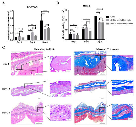Figure 4. dHCM biocompatibility. EA.hy926 (A) and MRC-5 (B) cells’ metabolic activity in commercial inserts (CTR), dHCM trophoblast side and dHCM reticular layer side. Representative images of H&E and Masson’s trichrome staining of dHCM subcutaneously implanted on BALB/c mice at three different time-points (4, 10 and 28 days) (C). * p ≤ 0.05; ** p ≤ 0.001; and **** p ≤ 0.0001.