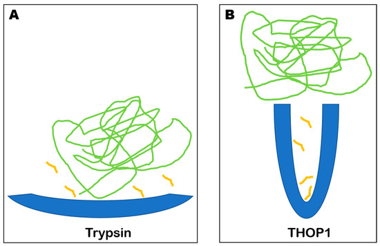 Figure 1. Schematic representation of trypsin and THOP1 catalytic cleft. (A) trypsin catalytic cleft is located on the enzyme surface, which allows some similar proteases to cleave large structured or unstructured proteins as well as relatively small peptides. (B) THOP1 catalytic cleft, distinctively from proteases such as trypsin, is located at the bottom of a deep and narrow channel. This structural organization makes proteins resistant to THOP1 cleavage. Oligopeptidases such as neurolysin (Nln) and prolyl-oligopeptidase (POP) also have similar substrate-size restrictions as THOP1. As far as it is known, only specific peptides in the size range of 5–22 amino acids have been described as substrates of THOP1. Blue figures, illustrates the enzymes trypsin and THOP1; small yellow lines, illustrates peptides; long green lines, illustrates a folded protein.