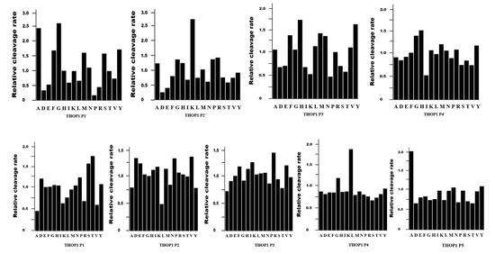 Figure 2. Analysis of the specificity of recombinant THOP1 regarding the enzyme preference for certain amino acids as potential substrates, positioned in specific sub-sites (P’ or P, defined according to Schechter and Berger) [39], using peptide libraries. Experiments were carried as previously described [41]. Briefly, for enzyme–peptide combinations in which the reaction rate was linear over substrate concentration [S] at 100 μM, values of kcat/KM were determined from initial rates (<10% turnover) at that concentration (where KM ≫ [S]). Catalytic parameters were obtained by determining initial rates at various substrate concentrations and fitting the data directly to the Michaelis–Menten equation using Kaleidagraph software [41]. Assays were performed in triplicate that varied less than 10% among each other. Enzyme concentrations used were based on protein concentration alone of homogeneously purified rat testis recombinant THOP1 [43].