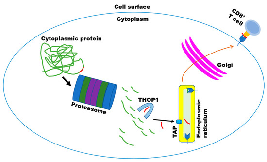 Figure 3. The major histocompatibility complex of class I (MHC-I) processing pathway. Most frequently only one peptide per protein is used as antigen presented by MHC-I (represented herein as the red line “peptide”). Note, this is the same proteasomal activity route that generates hundreds of additional non-antigenic intracellular peptides (InPeps; represented herein as green lines “peptides”). Self and viral proteins are degraded by the proteasome into peptides, which can be further processed by THOP1 to either inhibit or enlarge MHC-I antigen processing depending on the antigen [58]. A small fraction of these proteasome and THOP1 processed InPeps are transported into the endoplasmic reticulum lumen by transporter associated protein (TAP). Upon binding of only one of these TAP-transported peptides to MHC-I heterodimers in the lumen of the endoplasmic reticulum, the complex is transported to the plasma membrane where it is presented to the immune system through CD8+ T cells.