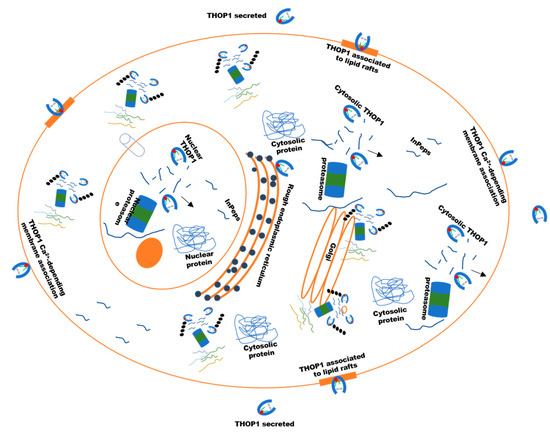 Figure 4. THOP1 cell distribution has implications for its function on peptide metabolism. THOP1 and proteasome shares similar subcellular distribution within cells, present free in the cytosol, associated with the cytoplasmic face of the endoplasmic reticulum and inside the nucleus [49,122,123]. These suggests that proteasome and THOP1 in concert can function degrading, respectively, proteins and peptides within cells. THOP1 has also an additional extracellular function as a secreted and membrane-associated enzyme, metabolizing neuropeptides such as opioids, bradykinin, neurotensin and gonadotrophin-releasing hormone (GnRH). THOP1 can be found in lipid rafts and associated to the plasma membrane in a Ca2+-dependent manner.