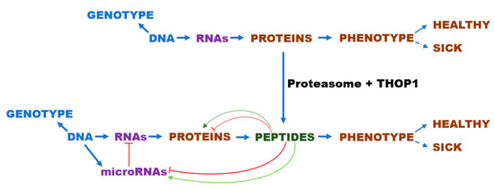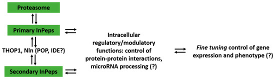 Because THOP1 is mainly located within cells, proteasome activity is suggested to produce most of its intracellular substrates. As previously mentioned, THOP1 has strict substrate-size specificity, not degrading proteins, suggesting that its biological functions should be mediated by peptides. Therefore, the major biological significance of THOP1 seems to occur by the following mechanism: THOP1 acting on peptides that were previously generated by proteasomal activity, controls specific InPep profiles in different tissues. Specific InPeps generated by the proteasome and further processed by THOP1 (or other intracellular peptidases such as Nln), can regulate protein-protein interactions and microRNA processing. These functions of InPeps could be affecting gene expression, and consequently, protein levels. Once protein levels are altered, their macromolecular interactions are subsequently modified, affecting the phenotype [164,165,166,167] (Figure 7). It seems relevant to mention that synthetic peptides identified by phage display have been previously shown to affect DICER pre-microRNA processing, reducing the levels of the mature microRNAs formed [147]. The ubiquitous existence of proteasome, THOP1, InPeps and microRNAs in different cells of different species, suggests a broader biological significance for this mechanism.