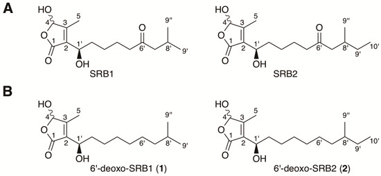 Structures of Streptomyces rochei signaling molecules. (A) natural signaling molecules SRB1 and SRB2 isolated from S. rochei 7434AN4; (B) 6′-deoxo-SRB1 (1) and 6′-deoxo-SRB2 (2) isolated from the srrO mutant (strain KA54) of S. rochei.