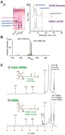 Metabolite analysis of strain KA54. (A) (i) TLC analysis of metabolites in strains KA54 (srrO mutant) and 51252 (parent). LC; standard sample of lankacidin C. (ii) HPLC analysis of metabolites in strains KA54 and 51252. Chromatogram was monitored by UV absorbance at 230 nm. Structures of lankacidin C and lankamycin were displayed in Supplementary Figure S1. (B) ESI-MS spectrum of KA54-SRBs (1 and 2). (C) 1H NMR spectrum of (i) KA54-SRBs (1 and 2) and (ii) SRBs.