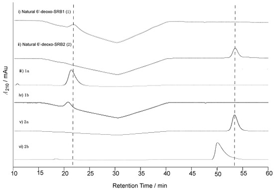 Determination of the C-1’ configuration of natural 6′-deoxo-SRBs (1 and 2) isolated from strain KA54. Chiral HPLC analysis of (i) natural 6′-deoxo-SRB1 (1), (ii) natural 6′-deoxo-SRB2 (2), (iii) synthetic 1a, (iv) 1b, (v) 2a, and (vi) 2b. Elution profiles were monitored by UV absorbance at 210 nm.