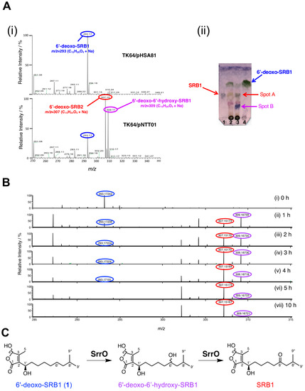 To examine the enzymatic conversion of 6′-deoxo-SRBs, we constructed SrrO expression system in Streptomyces. The srrO gene was cloned into pKAR3063H [23], a (His)6-tag derivative of streptomycete constitutive expression vector pHSA81 (Michihiko Kobayashi and Yoshiteru Hashimoto, personal communication), to afford pNTT01 (Figure S3A). This plasmid was transformed into the heterologous host, Streptomyces lividans TK64, to obtain the recombinant strain. Protein expression of (His)6-SrrO with 45-kDa in size was confirmed by SDS-PAGE (Figure S3B). Most Streptomyces P450 enzymes associate with electron-recycling redox partners, ferredoxin/ferredoxin reductase, and they flexibly accept heterologous redox partners in other Streptomyces [42]. We therefore performed enzymatic bioconversion of 6′-deoxo-SRB1 (1) by the recombinant SrrO protein with the help of heterologous S. lividans redox partners. In an ESI-MS analysis (Figure 5A), two molecular ion peaks at m/z 307 and 309 were detected in the recombinant S. lividans TK64/pNTT01. In a TLC analysis (Figure 5B), compound 1 (Rf = 0.8 in hexane-EtOAc = 1:2) was converted to two compounds in the recombinant S. lividans TK64/pNTT01 (lane 2); spot A showed a same Rf value with synthetic SRB1 (Rf = 0.5 in hexane-EtOAc = 1:2), while another spot B did lower Rf value (Rf = 0.2 in hexane-EtOAc = 1:2). Time-dependent oxidation of compound 1 was observed in ESI-MS spectra (Figure 5C). Molecular ion peak at 293 ([M + Na]+ = C15H26O4Na) for 1 diminished in a time-dependent manner (Panels i-vii), while that at 309 ([M + Na]+ = C15H26O5Na) appeared as a major peak at the 1 h period (Panel ii). After 2 h periods, molecular ion peak at 307 ([M + Na]+ = C15H24O5Na) corresponding to SRB1 became a major peak (Panel iii). Based on the C-6′ oxidation degree in SRB biosynthesis, an intermediate with molecular ion peak at 309 was estimated to be 6′-deoxo-6′-hydroxy-SRB1 (Figure 5C), which possibly corresponded to spot B with lower Rf value on TLC (Figure 5B). Thus, SrrO converts 6′-deoxo-SRB1 into SRB1 via 6′-deoxo-6′-hydroxy-SRB1.