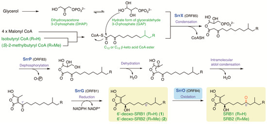 Streptomyces rochei strain 7434AN4 produces two structurally unrelated polyketide antibiotics, lankacidin and lankamycin (Figure S1), and carries three linear plasmids (pSLA2-L, -M, and -S) [12]. Lankacidin and lankamycin inhibit peptide synthesis synergistically by targeting neighboring sites in bacterial ribosome [13,14]. In addition, lankacidins could exhibit considerable antitumor activity in paclitaxel-like action [15,16]. These biosynthetic gene clusters are located on the largest giant linear plasmid pSLA2-L (210,614 bp) [17,18,19,20]. In addition, their regulatory genes including an SRB biosynthesis gene (srrX), an SRB receptor gene (srrA), and two SARP (Streptomyces antibiotic regulatory protein) genes (srrY and srrZ) are coded on pSLA2-L. We revealed that the signaling pathway goes from srrX through srrA to srrY, leading to lankacidin production [21,22]. For lankamycin production, srrY directly activates the transcription of srrZ [23]. In addition, we have elucidated the chemical structures of signaling molecules SRB1 and SRB2 in S. rochei; SRB1 was determined to be 2-(1’-hydroxyl-6′-oxo-8’-methylnonyl)-3-methyl-4-hydroxybut-2-en-1,4-olide (C15H24O5), while SRB2 was 2-(1’-hydroxyl-6′-oxo-8’-methyldecyl)-3-methyl-4-hydroxybut-2-en-1,4-olide (C16H26O5) (Figure 1) [11]. Their C1’ stereochemistry was determined to be R based on chiral HPLC analysis. It is noteworthy that several possible genes for SRB biosynthesis were found around srrX (orf85) on pSLA2-L; an NAD-dependent dehydrogenase gene srrG (orf81), a phosphatase gene srrP (orf83), a P450 monooxygenase gene srrO (orf84), and a thioesterase gene srrH (orf86).