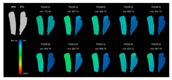 The disease progression from NAFL to NASH is related to the accumulation of specific lipotoxic molecules in the liver [8,9,13,48,49,50,51,52,53]. Our untargeted analysis identified as putative triglycerides approximately 51% of the metabolites differentially expressed between the two experimental groups, highlighting the abundance of these molecules. Targeted approaches identified 14 triglycerides upregulated in livers from HFD-fed animals, which highlights them as potential key agents in the development of the disease. Interestingly, 9 of these 14 triglycerides have been identified in previous studies [54,55,56]. Additionally, our study identified 5 new triglycerides upregulated in livers from HFD-fed animals: TG(43:1), TG(44:0), TG(46:0), TG(47:0), and TG(49:0). The differences among studies could be due to the different experimental models used (involving different mice strains and diet compositions) or the different methods for compound identification. These differences highlight the need to standardize methodological approaches to allow comparisons among different laboratories and facilities. Because of the lack of inter-study standardization and the variability among studies, we validated our data by monitoring the spatial distribution of the identified triglycerides by LDI–MS tissue imaging in liver cross sections. Tissue imaging confirmed that 10 of the 14 identified triglycerides were homogeneously distributed over the whole surface of liver sections from HFD-fed animals, while they were barely detectable in control animals.