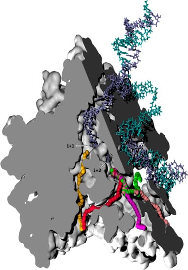 Nucleoside triphosphate (NTP) pathways in RNAPII. The cutaway view through the enzymatic complex is rendered via two cutoff planes (light and dark grey solid fills). The displayed conformation is from simulation aMD_A1 (simulation indexes are listed in Table 1). The protein walls are represented as white surfaces. The template and non-template DNA strands are fully shown, in fade blue and cyan stick representation, respectively. The pathway axes verifying maximal distance from protein interlining atoms for secondary channel (CH2) (orange), CH3A (red), CH3B (magenta), CH3C (pink), and CH3D (green) subchannels are shown as a series of balls. The latter trajectories are generated with a custom-built pathway-exploration algorithm. The CH2 trajectory leads to the i + 1 register, whereas the CH3A/B/C/D paths lead to the i + 2 position.