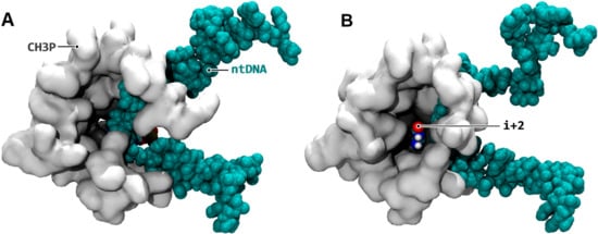 TFIIF is a general transcription factor known to participate in the transcription initiation phase and is also predicted to impact the conformation of the RNAPII complex during elongation [,,]. Figure 1 displays four unobstructed solvent-accessible paths to the exposed downstream i + 2 register when TFIIF actively rearranges the downstream bubble, a process detailed hereafter. In simulations aMD_A1 to 6 (the simulation indexes aMD_A to N described in this article are listed in Table 1) of the initial equilibration of the RNAPII-TFIIF complex, a significant remodeling of the transcription bubble was observed as follows: TFIIF interacted mainly with non-template DNA (ntDNA) positions i + 14 to i + 12 and i − 7 to i − 29 and with template DNA i − 30 to i − 8 and i + 8 to i + 12 registers (weakly with i − 9 and i − 23 to i − 27). The latter interaction was carried out through six articulated modules (Figure S2A,B). Module 1 (RAP74 166 and 169–172) is localized at the central section of the charged α1 helix (RAP74 152–186); Module 2 (RAP74 67–92) spans across the arm (RAP74 49–62 and 73–97) and insertion 1 (RAP74 62–73) domains; Modules 3 (RAP30 192–201), 4 (RAP30 223–234), and 5 (RAP30 209–212, 214, and 218) belong to the RAP30 winged helix (RAP30 176–249); Module 6 (RAP30 154–177 and 180) of the linker domain (RAP30 119–176) is adjacent to the winged helix. The observed rearrangement of the different DNA-interacting modules was the following: Module 1 anchored the downstream DNA helix through ntDNA i + 12 to i + 14 positions. Module 2 folded against Modules 3 and 4, which constricted upstream ntDNA about the i − 9 to i − 16 positions. The conjunction of the upstream strain induced by TFIIF Modules 2 to 4 on one side, with the downstream anchor provided by Module 1 on the other side, resulted in folding of ntDNA in between these modules (Figure S2C,D). Modules 5 and 6 interacted with the exiting reannealed DNA helix and the upstream template strand, respectively, which provided additional contacts to stimulate DNA remodeling. The folding of the non-template strand, observed most significantly around i + 2 to i − 6 positions, freed up a cavity inside the downstream bubble, where the template i + 2 register then inserted (Figure 2).