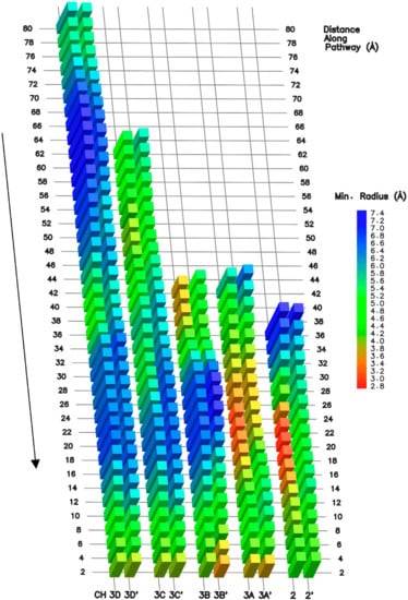 NTP pathways conformational fit. Right to left columns represent minimal radius along the pathway axis of CH2, CH3A/B/C/D, generated by the pathway-exploration algorithm. The displayed processed trajectory is the last 100 ns of simulation aMD_A1. The prime symbol indicates the conformational analysis spanning 100 ns in an alternative trajectory, i.e., CH2′ (aMD_A5), CH3A’ (aMD_B’1), CH3B’ (aMD_B4), CH3C’ (aMD_B4) and CH3D’ (aMD_B4). The arrow (left) indicates the direction from the exterior of to the enzyme to the buried i + 1 and i + 2 registers for the CH2 and CH3A/B/C/D pathways, respectively. The first displayed minimal radius value (top row) is from a distance of about 6 Å along the starting of the pathway (so as to discount the initial convergence of the exploration towards the optimal pathway center).