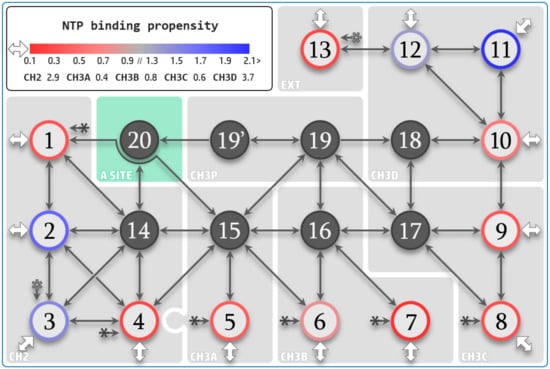 NTP diffusion map. Amino acids lying about the path of substrate diffusion are divided into twenty macro-regions (MR). Entry MR1 to 13 are shown as color-contoured discs, where the disc contour codes propensity to NTP binding. MR13, located externally (indicated by “EXT”) to solvent pathways, connects MR3 and MR12. Infiltration MR14 to 20, defined as not accessible directly from bulk solvent, are shown as grey discs. “A site” designates the active site region encompassed by MR20. MR19′ denotes necessary downstream NTP isomerization against the bridge helix before transfer to MR20. Solid and empty star symbols represent connections that are not fully drawn. White arrows indicate initial diffusion from the bulk solvent to the entry sites. The binding propensities are defined as the average number of bound NTPs during aggregate simulation time and are indicated for the entry macro-regions. Propensities are also listed for CH2, CH3A/B/C/D overall, and are defined as the cumulative average amount of NTPs bound to MR1/2/3/4/14 for CH2, MR5/15 for CH3A, MR6/7/16 for CH3B, MR8/9/17 for CH3C, and MR10/11/12/18 for CH3D. MR1/4/5/6/7/8 are interconnected through a common junction area (solid star symbol connection). The CH3A and CH2 pathways (MR5 and MR1/4) overlap about the funnel region (represented by the imbrication of the grey shaded areas).