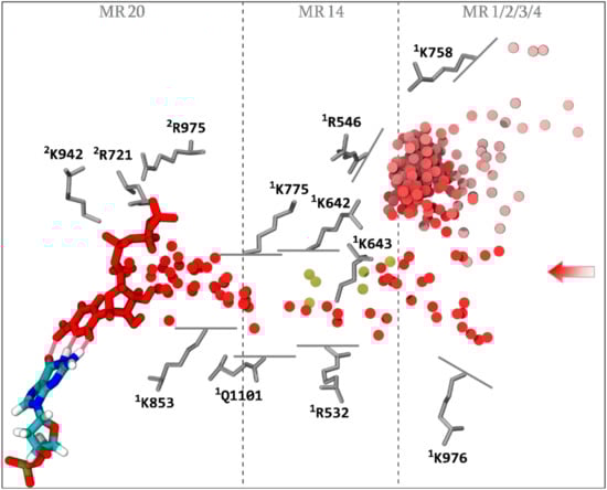 In addition, partial loadings in six alternative simulations were sampled (Figure 5, gold discs). Altogether, the following observations emerge. An energetic barrier seems to lie at the transition between the funnel (MR1/2/3/4) and the corridor (MR14). Although a significant number of NTPs are located in the funnel at any one time (on average 2.94), only seven transitions in the corridor (six partial loadings and one complete loading) were sampled. A second energetic barrier lies near the center of MR14, as only aMD_A5 captures a complete transition through MR14. Transition through the corridor involves rotation around 1K642, 1K643, and 1R532 residues (with contribution of 1K775); see Materials and Methods for the residue naming convention used in this paper. In simulation aMD_A5, the NTP binds in an inverted position through its phosphate group to 1K775, 1R532, and 1K643, before undergoing rotation through the corridor. In the partial loading simulation aMD_F5, polyphosphate coordination is achieved through 1K642 and 1K643, preceding NTP rotation. In the additional partial loading trajectories, a similar mechanism was observed. Overall, incoming NTP triphosphate moieties anchor to two or more residues (1K642, 1K643, 1R532, and 1K775), and then initiate rotation across the corridor. Once the rotation is complete and the NTP inserts through MR14, NTPs load via the remainder of the channel without encountering any significant energy barriers. Simulations aMD_K1 and K2 restarted from the rotated MR14 insertion state, sample diffusion to the active site region in 16 and 34.5 ns, respectively. Transition from MR14 to MR20 involves initial polyphosphate coordination through 1K642 and 1K775, followed by 1K775 on its own, before detaching from 1K775 and completing insertion into the catalytic site. Other amino acids belonging notably to the trigger loop and the bridge helix participate in the loading; detailed amino acid contributions along CH2 diffusion are listed in Table S3. The observation of the reverse diffusion trajectories (Figure S4) following a similar amino acid coordination map from the input path, supports that CH2 can exchange substrates in and out of the enzyme.
